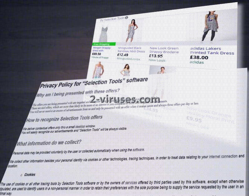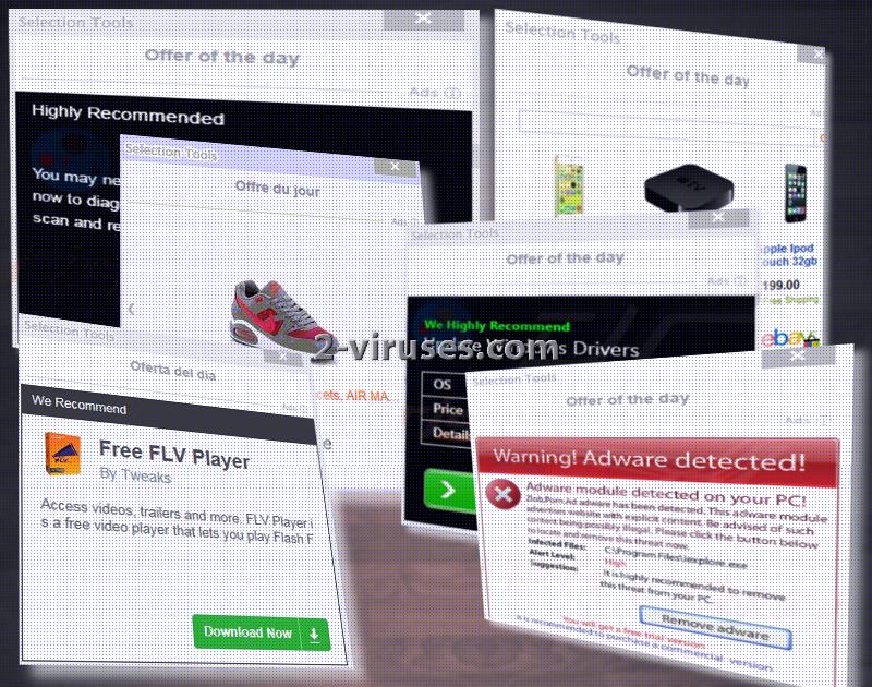 Selection Tools har klassificerats som en reklamstöttande applikation som tjänar pengar på att distributera innehåll av olika utgivare, samt annat tredjepartsinnehåll. Vi la märke till att olika erbjudanden kan presenteras som reklam av Selection Tools. Innehållet fluktuerar mellan kläder, skor, smycken, elektronik till tjänster inom teknisk support och andra säkerhetsmeddelanden. Vi har även lagt märke till att applikationen kommer rekommendera och visa popups eller banderoller som källor för nya program. Du bör redan vara väl informerad gällande nedladdning av program från okända källor. Det är viktigt att betona riskerna med att intressera sig för reklam av Selection Tools. Vi har fått in klagomål angående att den här applikationen har presenterad skurkaktigt material som antingen planerar att infektera dig med skadeprogram/ potentiellt oösnakde program, eller stjäla användares personliga information.