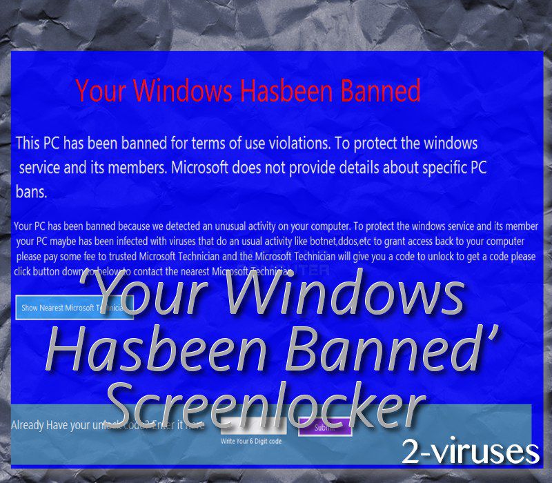 ‘Your Windows Hasbeen Banned’, även kallad ‘Your Windows Has been Banned’, är en relativt ny skärmlåsare, som upptäcktes november 2016 (första versionen). ‘Your Windows Hasbeen Banned’ är faktiskt den första versionen av skärmlåsaren, medans ‘Your Windows Has been Banned’ är den andra (upptäcktes 13:e december 2016). De är praktiskt taget identiska, endast att den andra versionen har skrivfelet i namnet korrigerat och det innehåller dessutom kompletta kontaktuppgifter för support. Det är en trojaninfektion, eftersom användaren av den infekterade datorn blir falskt informerad om att ”ovanlig aktivitet” har upptäckts på enheten och bör i enlighet kontakta närmsta Microsoft tekniker för att lösa problemet. Faktumet är dock att det är en teknisk support bedragare på andra änden som låser skärmen.